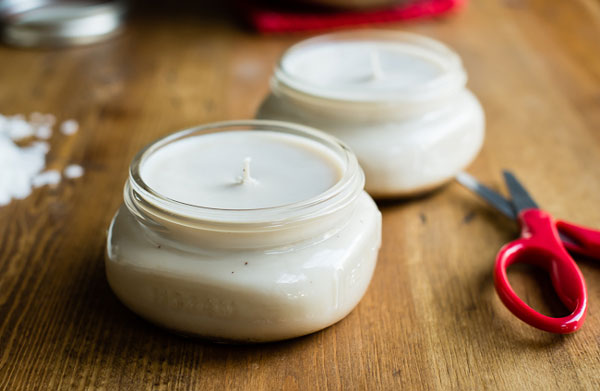 Аккуратно наливаем приготовленный воск в баночки, фитиль должен быть на верху. Даем нашим свечкам застыть. Теперь их можно зажечь и наслаждаться видом огня и приятным запахом.